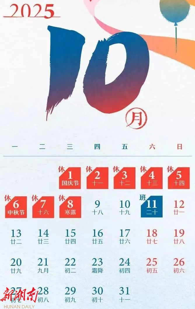 :10月1日(周三)至8日(周三)放假调休,共8天。9月28日(周日)、10月11日(周六)上班。