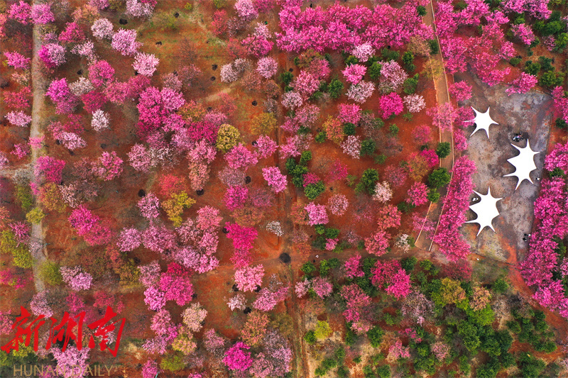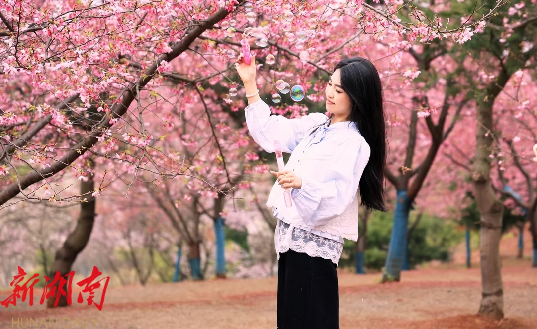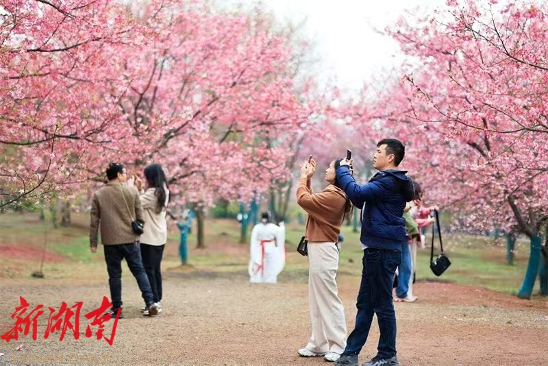 桂阳樱花园“粉红佳人”迎来盛花期 吸引众多游客踏春赏花