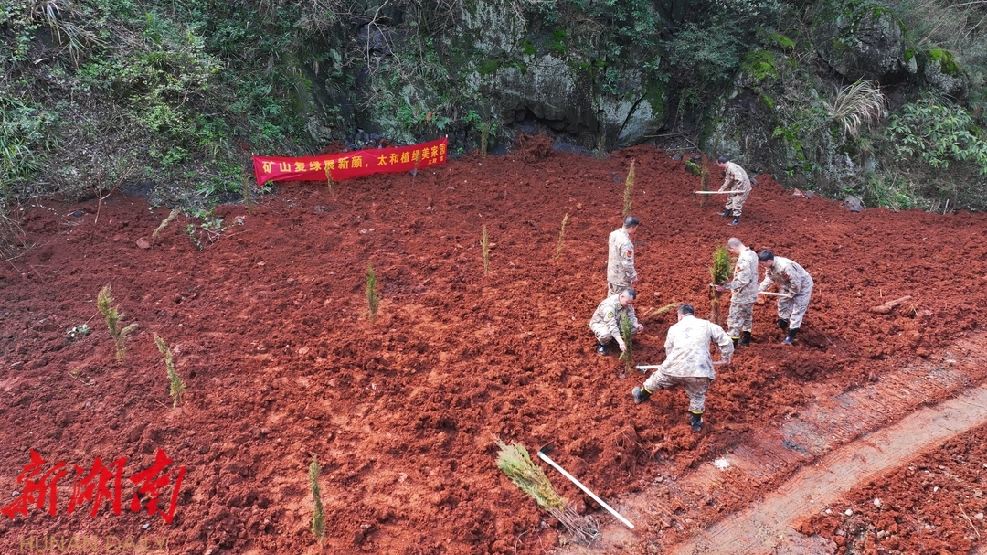 在太和镇太清矿区太和片区山涧段,民兵们松土、挖刨、栽种、压实,在一轮轮的辛勤劳动下,翠绿的柏树苗、油桐、栾树扎根在矿山土地上,为矿山复绿再添力量。太和镇民兵应急排排长欧阳晓宏说:“今天是植树节,我们加入到矿山修复的这个植树队伍中,希望通过我们的努力,让我们的后代,让更多人享受到绿水青山的生态环境。”
