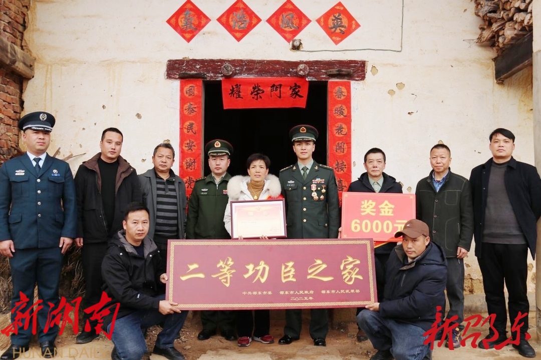 新邵东客户端3月12日讯(记者 刘意忠 通讯员 雷晓宇 戴益源) 3月11日,邵东市人武部联合市退役军人事务局来到简家陇镇枫木村,为荣立二等功的现役军人王闰及其家属送去立功喜报和荣誉牌匾,让军人军属共享尊崇荣光。