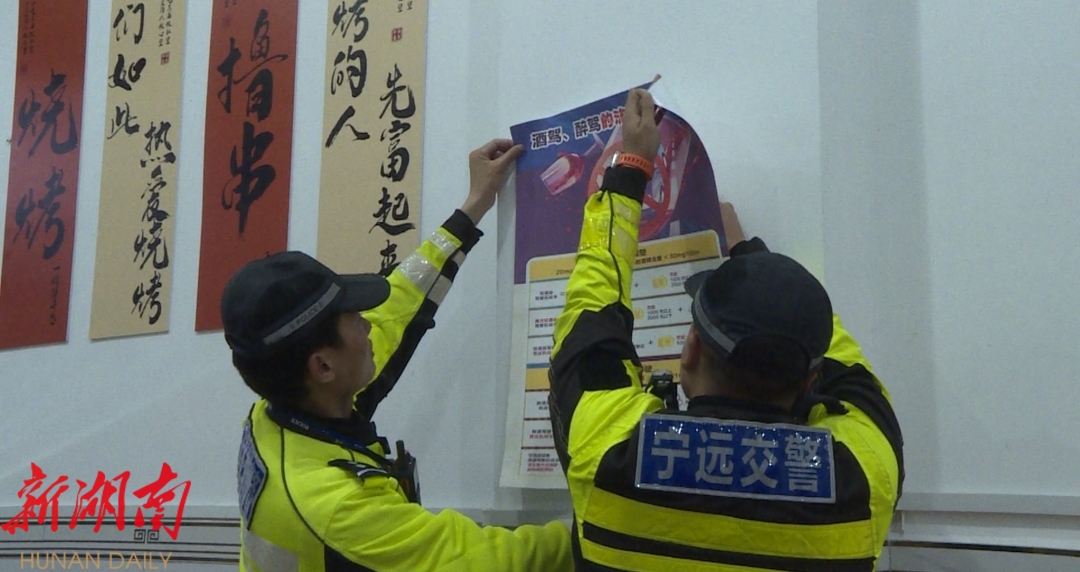 ,民警走进夜市,将交通安全提示和宣传海报张贴在摊位显