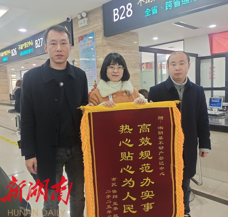 湖南日报·新湖南客户端3月12日讯(通讯员 杨妹)近日,湘阴籍市民王女士来到湘阴县不动产登记中心,为该中心工作人员送上一面锦旗。“没想到你们能专程赶过来,这下房子终于能过户了!”王女士开心地说道。
