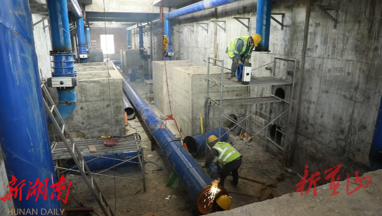 走进三蓝水厂及供水管网建设项目 (一期) 现场,机器轰鸣、焊花飞溅,吊车高耸挥舞长臂,工人们正紧张有序地进行建筑物、构筑物装修和工艺管道施工,现场呈现一派繁忙景象。
