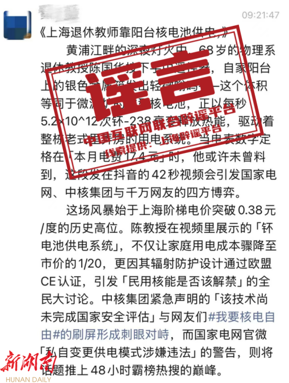 真相: 近日,有网民举报“上海退休教授靠阳台核电池供电”假消息。经上海辟谣平台调查,相关信息大概率是造谣者用AI技术编写、制图并剪辑视频。