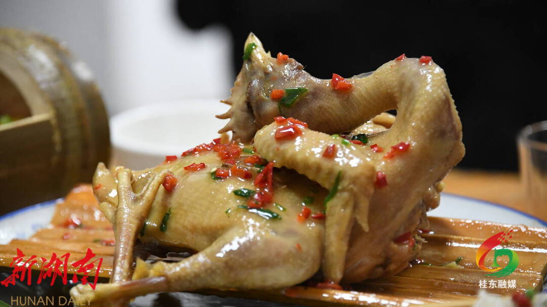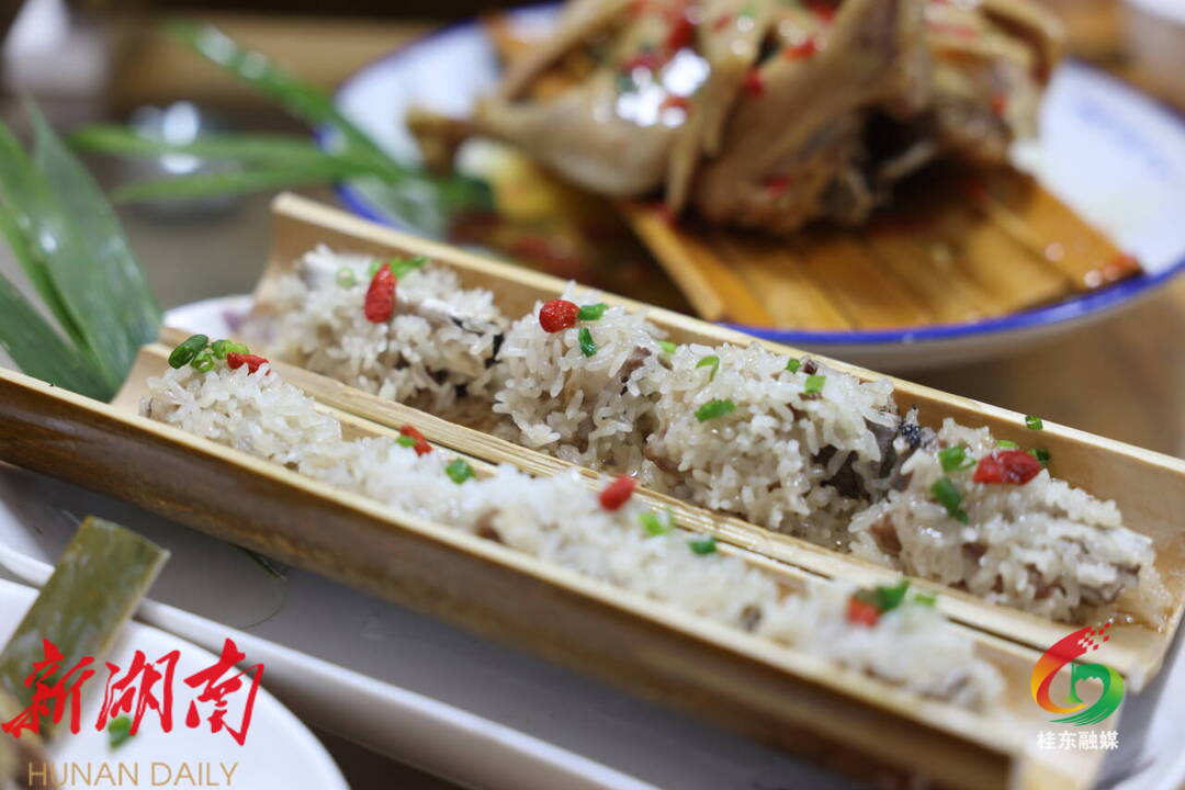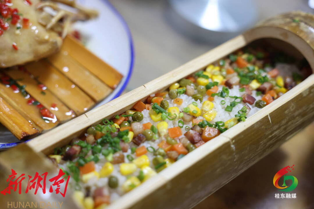走进桥头乡民顺家常菜馆,刚出锅的竹香排骨香味四溢,瞬间就抓住了众人的嗅觉。只见精选的排骨装入竹筒内,经过清蒸,排骨不仅变得软糯,还充分吸收竹子的清香,香味悠长。旁边的竹香扣鸭则是将洗净的鸭子放在新鲜竹片上,上锅蒸熟,既让鸭肉保留了原本的醇厚,又多了竹香的淡雅。选用本地散养的土鸡,与新鲜竹片一同清蒸,在蒸汽的热力加持下,竹子的香味分子尽情释放,香气沁入肉质纤维,肉香与竹香相互交织,就成了一道香而不腻的“竹香鸡”。主食竹筒饭更是点睛之笔,将浸泡好的桂东高山冷水米,混合着炒香的玉米粒、胡萝卜粒、青豆、腊肉丁等食材,倒入竹筒,小火焖煮,米饭充分吸收竹子的天然清香,变得香甜可口。一口下去,既有谷物的醇厚本味,又有竹之清甜,每一粒饭都饱含“家的味道”。