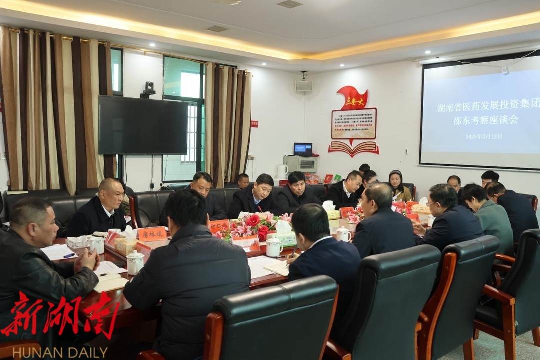 新邵东客户端3月13日讯(记者 曾超众) 3月12日,湖南医药发展投资集团有限公司党委副书记、副董事长、总经理苏德辉一行来邵东市考察中医药产业发展情况。邵东市委副书记、市长付凯军主持考察座谈会,邵东经开区党工委副书记、管委会主任杨振明,邵东市副市长谢辉伟以及有关部门、企业负责人等参加座谈。
