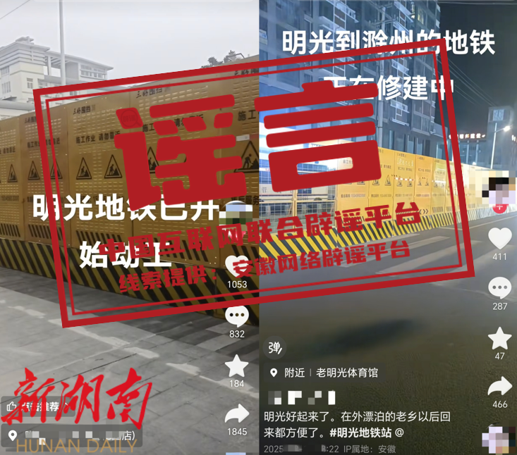 真相: 近日,网民“张**”“沙**”等发布视频,编造并传播“明光地铁已开始动工”相关虚假信息,并配以误导性视频,引发关注和讨论。经核实,相关视频内容对应区域施工项目并非修建地铁,网传视频系谣言。明光市委网信办和市公安局已依法对张某、沙某等进行批评教育,并要求其删除相关不实信息。(来源:“安徽省互联网违法和不良信息举报”微信公众号、明光市委网信办)