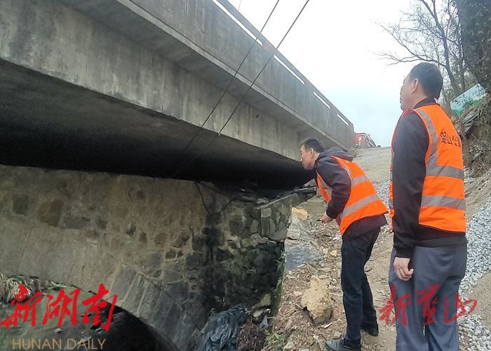 新蓝山客户端3月14日讯 (通讯员 马朝辉)3月13日上午,在G537蓝山舜水大桥、新铺子桥、牛塘口大桥、南风坳隧道等路段,蓝山县公路养护技术人员正对沿线桥梁伸缩缝、护栏、支座、墩柱及南风坳隧道出水口等进行细致检查。
