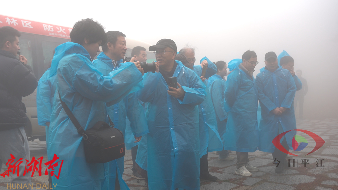 当天上午,采风团踏访了平江天岳幕阜山,在雾霭缭绕中探寻山水与文学的共生之境,以笔墨叩响这座神山的千年回音。雾中穿行,大家时而驻足观石,摩挲岩壁上岁月刻痕;时而静听林涛,捕捉风中散落的传说。山峦隐入混沌,诗意却浮出云海。