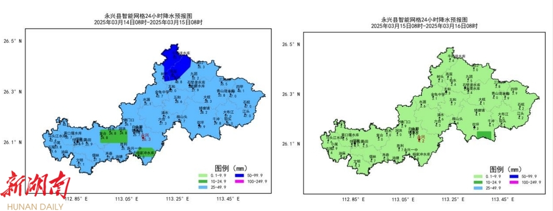 13 月 14 日 08 时至 15 日 08 时(左)和 3 月 15 日 08 时至 16 日 08 时(右)永兴县降 雨量预报图