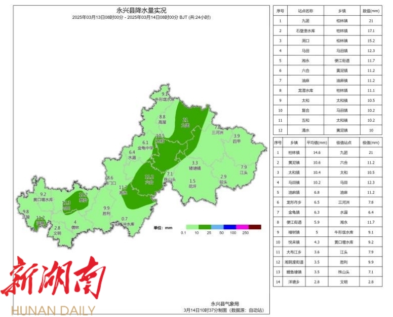 3月12日至13日晚上,我县出现雷雨大风强对流天气。 据全县自动气象站监测,13日08时至14日08时,全县平均降雨量6.6毫米,其中0~9.9毫米32站(14乡镇),10~24.9毫米13站(6乡镇),最大降水21毫米(柏林镇九团站),永兴国家站降雨量为10毫米。
