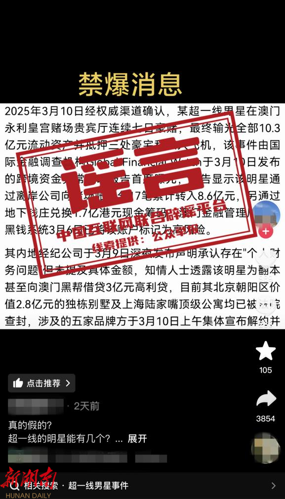 辟谣:使用AI捏造“顶流明星在澳门输了10亿”谣言,扰乱公共秩序,依法行政拘留