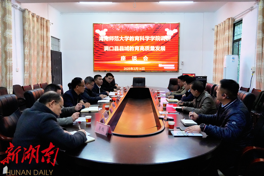 洞口融媒3月14日讯(记者 肖皓静 通讯员 蒋琳琳 ) 3月14日下午,湖南师范大学教育科学学院党委书记向发意、学院副院长赵亮率队到洞口县调研县域教育高质量发展。县政协党组书记、主席向兵,县委常委、县委宣传部部长唐煜及县教育局等相关单位负责人参与调研。