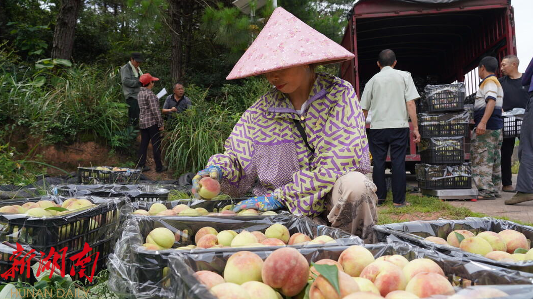 每年7月,是中方县桐木镇半界村最繁忙的时节,果园里,沉甸甸的果实压弯了枝头,果农们正忙着包装、分拣、装箱,货车络绎不绝,一筐筐色泽红润,新鲜饱满的桃子随着货车运往外地。