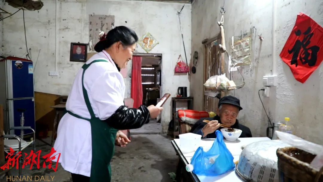 出餐后,工作人员迅速打包好饭菜,为行动不便的独居老人送饭上门。每到一户,工作人员都会热情地与老人打招呼,询问身体状况,并录下视频发给子女,确保他们不仅吃得饱,还能感受到村里的关怀与温暖。