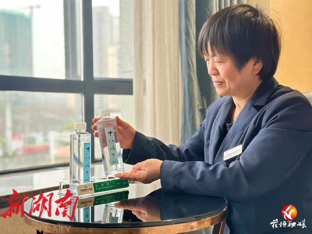 在兴鹏国际大酒店,客房主管何小玲每天早晨都会在打扫房间的时候,在免费饮用区摆上两瓶十八洞山泉水,让入住的客人一品山泉水的甘甜。