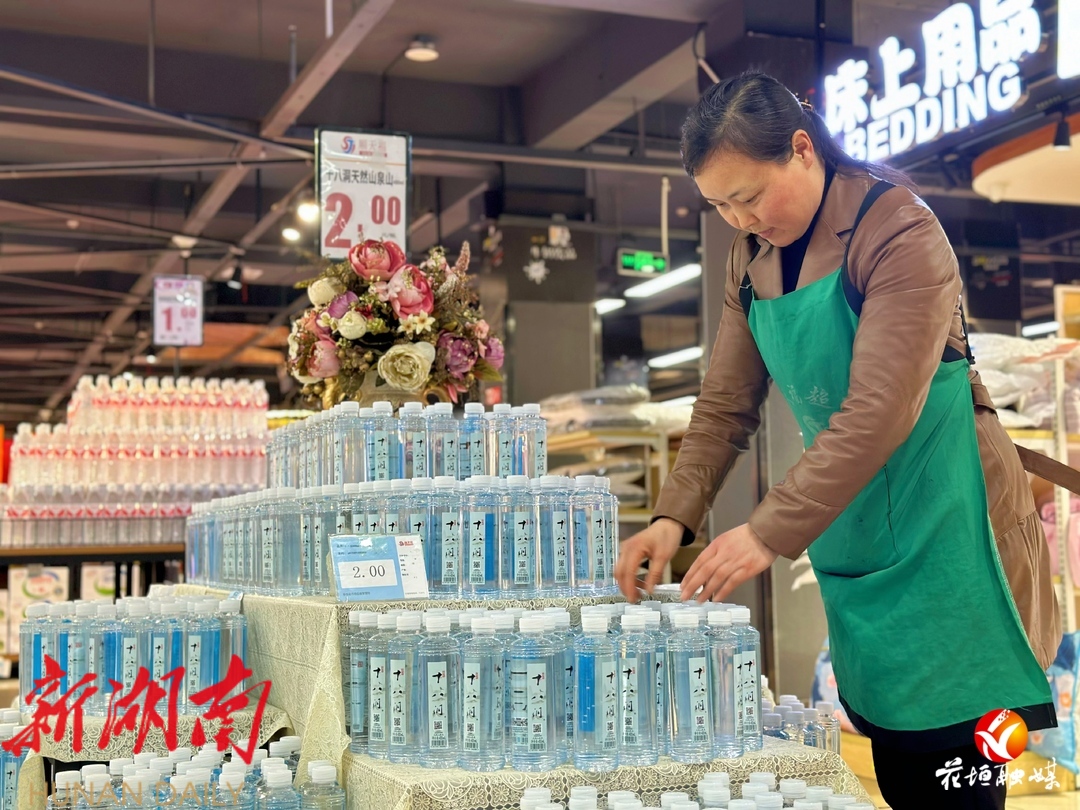 湖南日报·新湖南客户端3月17日讯(通讯员:肖引霞 吴云)“这个是我们刚进的新品,已经陆陆续续卖出去了很多。”花垣县顺天福超市食品主管麻丽娜看着眼前摆放整齐的十八洞山泉水说道。
