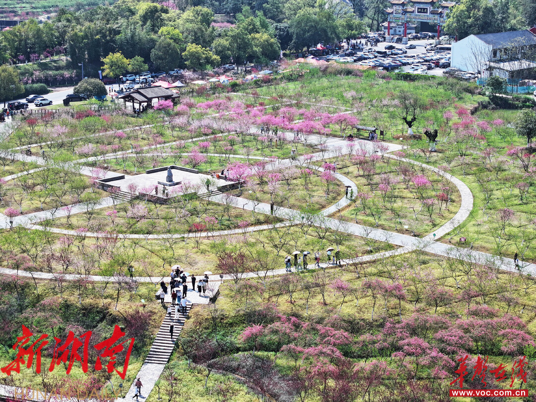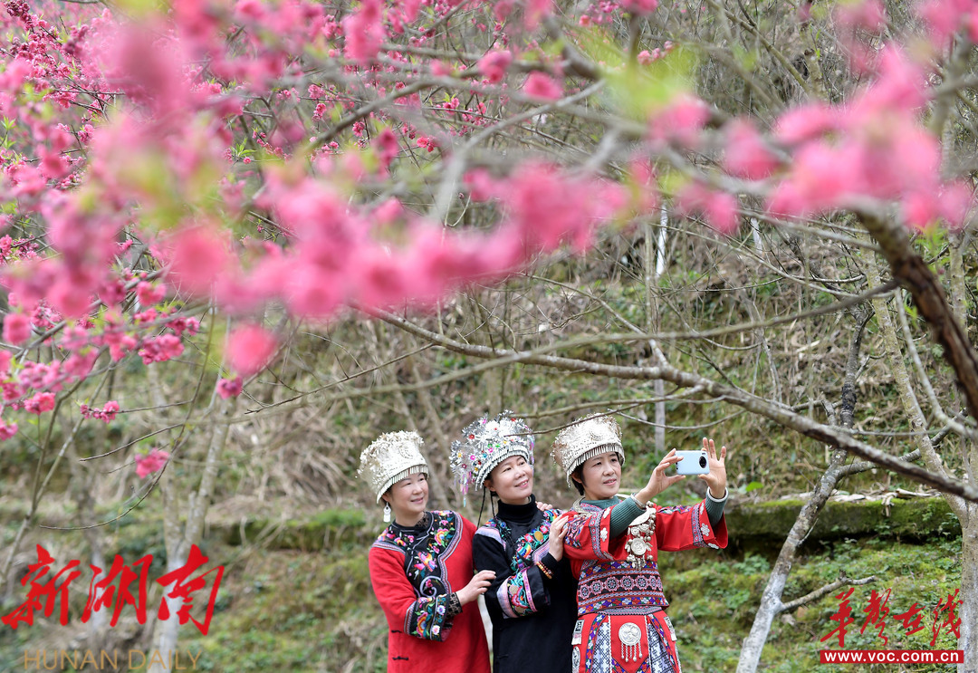 (城步苗族自治县桃林村的2000多株观赏性桃花进入盛花期,吸引众多游客前来踏青赏春。严钦龙摄)