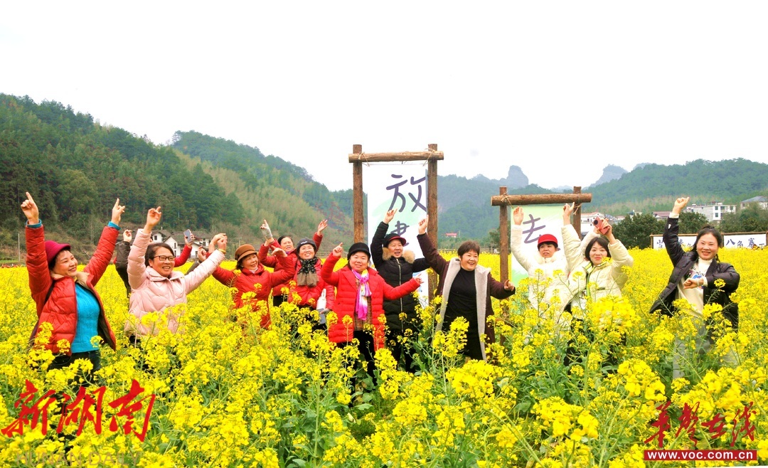 (游客在崀山油菜花田里打卡拍照。石国兴摄)