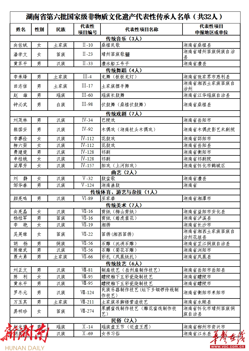 近日,文化和旅游部公布了第六批国家级非物质文化遗产代表性传承人名单,共942人。其中,湖南32人入选。