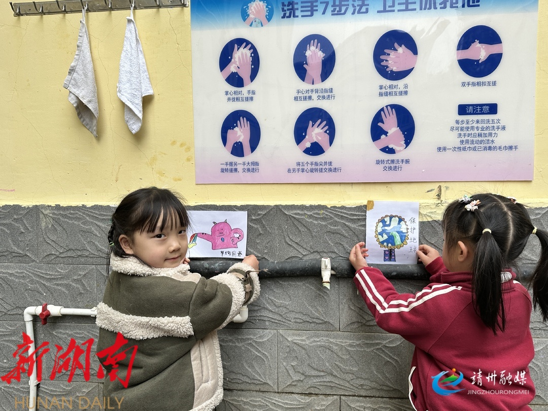 幼儿们将设计的节水标志粘贴在洗手池(谭唱 供图)