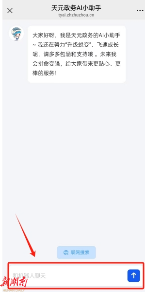 近日,由天元区数据局、株洲国投智慧城市产业发展投资有限公司联合开发的“i天元·天元政务AI小助手”(以下简称“i天元”)在株洲高新区、天元区官方微信公众号“株洲新区发布”上试运营。“i天元”将聚焦惠企政策精准推送与高频事项便捷办理两大功能,助力企业、居民“少跑腿、办成事”。