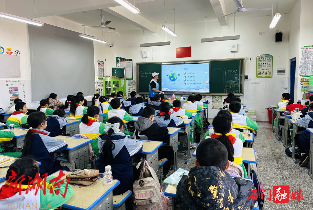 3月18日上午,石门县气象局与县第三完全小学联合举办气象科普研学活动。气象志愿者们走进课堂,通过趣味问答、视频动画展示等,向学生讲解天气原理、天气预报制作流程、极端天气防御知识,并发放气象知识手册百余份。
