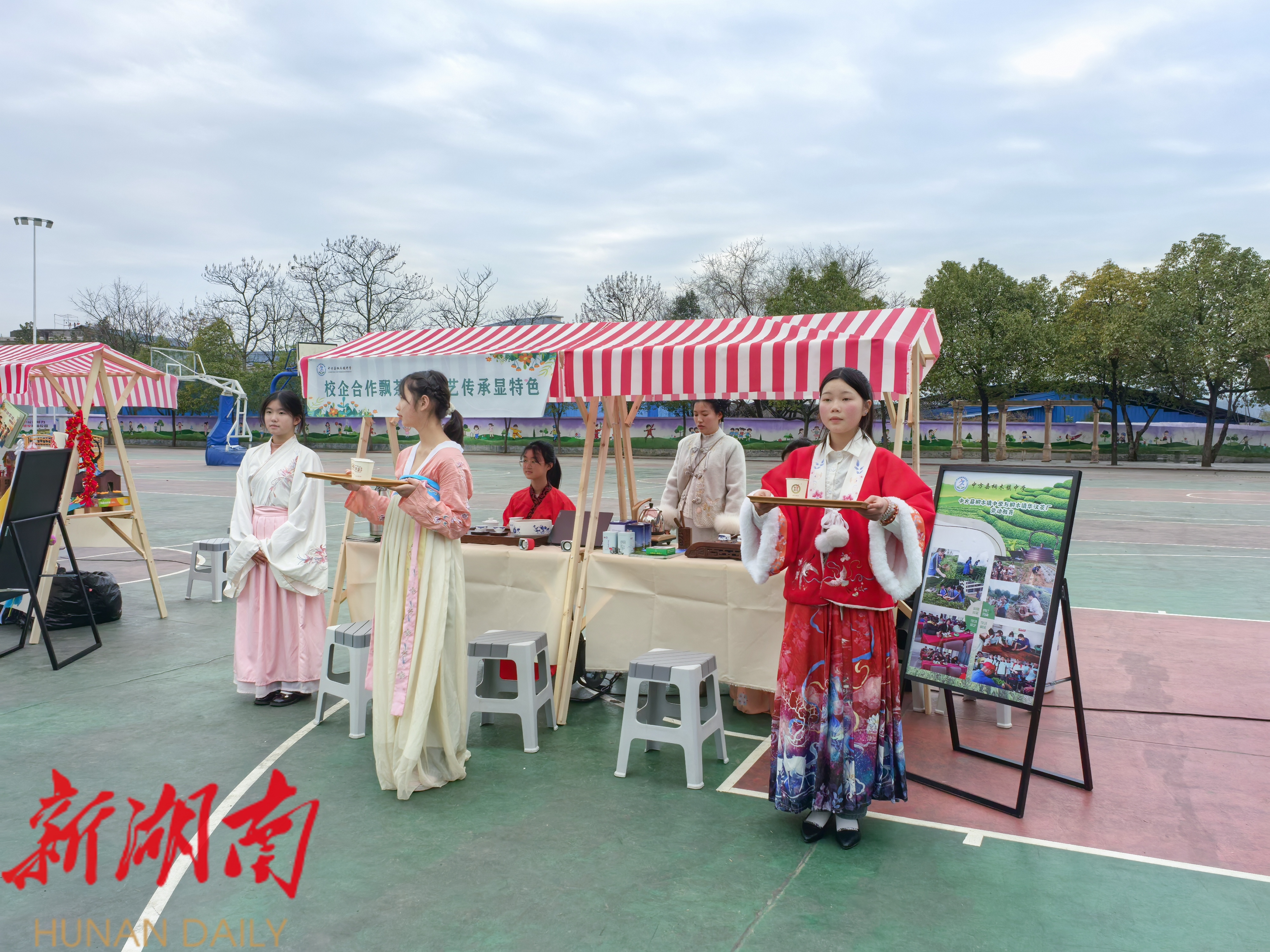 在茶艺展示环节,身着汉服的学生们以“工夫绿茶冲泡”为主题,完整呈现温杯洁具、投茶醒茶、悬壶高冲等十二道传统茶艺。并将侗家油茶、苗族茶俗等非遗元素融入解说,构建起 "茶、乐、诗、礼" 四位一体的文化场景。