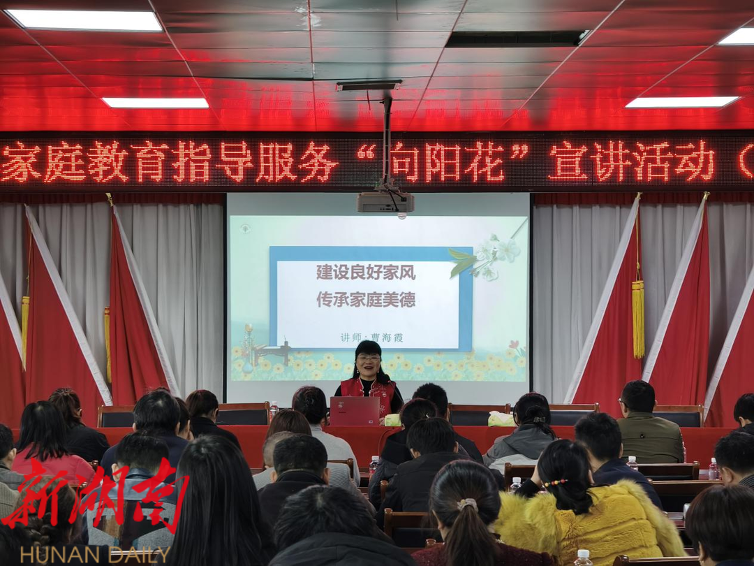新桂阳3月20日讯(通讯员 陈思佳)为推动家庭教育促进法的实施,提升家长家庭教育理念和能力,促进儿童健康成长,3月18日,塘市镇在县妇联的指导下开展2025年家庭教育指导服务“向阳花”宣讲活动。国家二级心理咨询师、家庭教育高级指导师曹海霞老师受邀作专题宣讲,围绕“建设良好家风 传承家庭美德”主题,为现场40余名家长带来一堂生动深刻的家庭教育指导分享课。