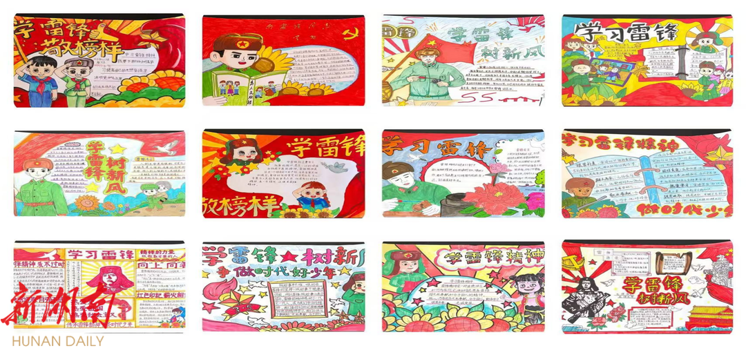 活动通过绘画、手抄报、续写日记等形式展开。 三、四年级学生化身“小小宣传员”,精心制作 “学习雷锋,致敬榜样”主题手抄报。A3纸上,工整的文字、生动的插画和创意的排版,展现着学生对雷锋精神的深刻认知。