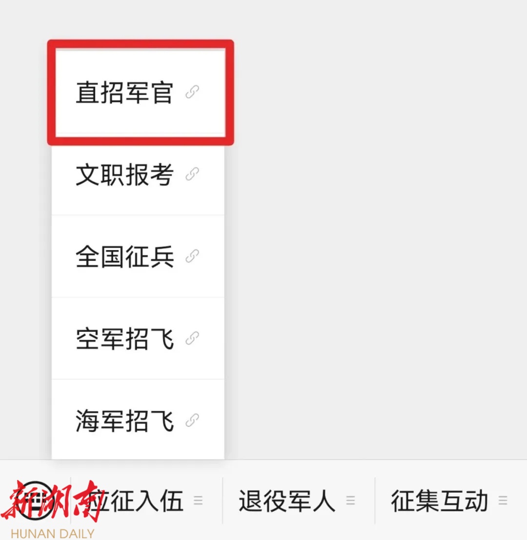 关注“央视军事”微信公号,点击聊天界面下方“应征入伍”一栏,再点击“直招军官”,可直接进入报名页面。