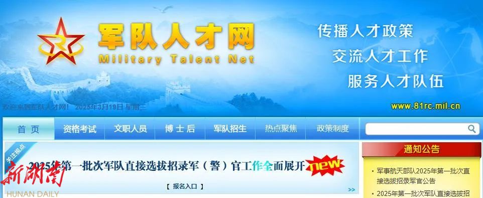 2025年第一批次军队直接选拔招录军(警)官工作于3月20日至30日开启在线报名。