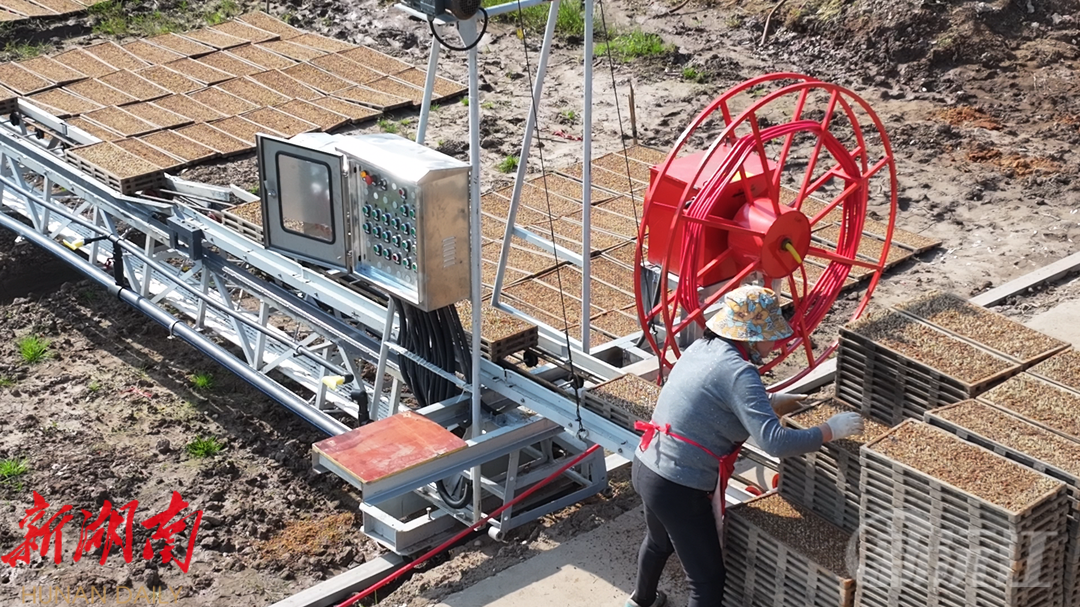 走进占地1000余平方米的草尾镇育秧工厂智能化育秧车间,一条全自动播种流水线正以每小时2400盘的效率全速运转,在智能引导之下,流水线精准地完成铺土、洒水、播种、覆土等工序,播种完成的秧盘随即进入恒温恒湿的出芽密室,静待出芽整齐后再摆放到秧田芽床。