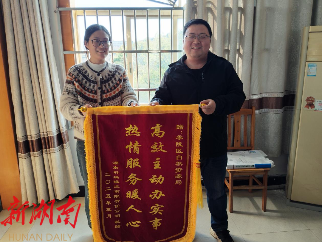 湖南日报·新湖南客户端3月21日讯(通讯员 唐方刚 张青云 罗玲珊 )近日,湖南科瑞锰业有限责任公司代表专程到永州市零陵区自然资源局赠送了一面印有“热情服务暖人心,高效主动办实事”的锦旗,感谢该局在办理公司相关项目手续时提供优质高效、热情周到的服务。