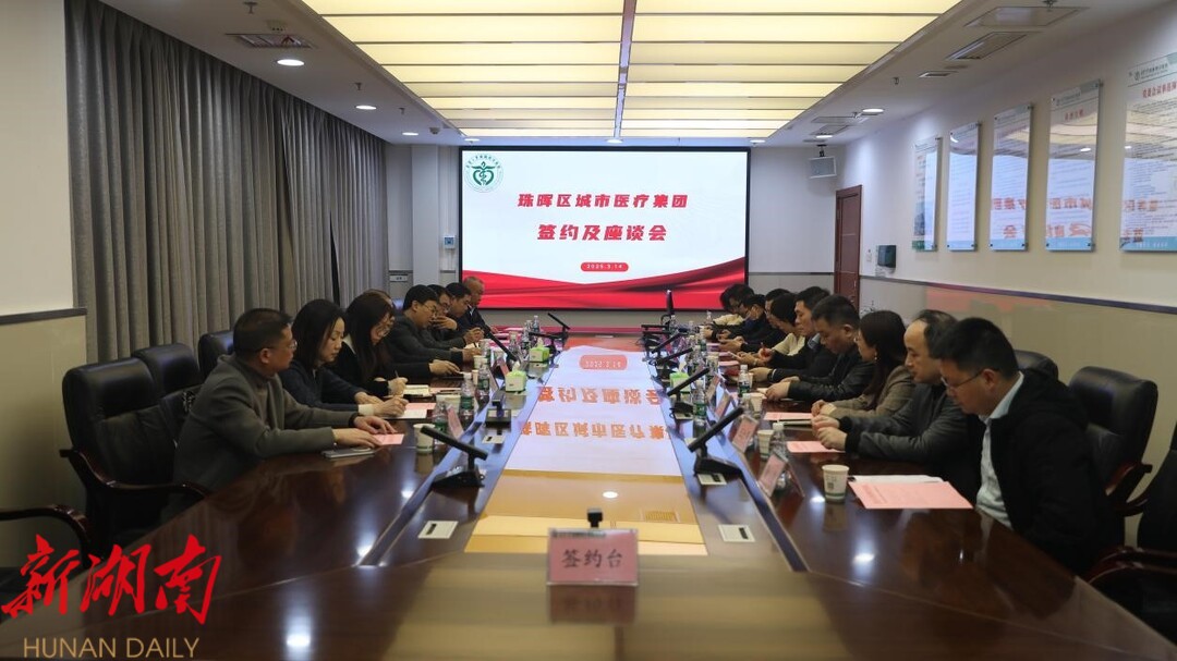 衡东融媒3月22日讯(通讯员 胡斯达 刘昭维 胡璇 袁云帆) 3月14日下午,珠晖区城市医疗集团签约仪式暨座谈会议在南华大学附属南华医院门诊六楼党政会议室举行。受珠晖区人民政府委托,南华医院与珠晖区各医疗机构正式签署珠晖区城市医疗集团合作框架协议,珠晖区卫健局党组书记、局长刘辉,珠晖区医保局党组书记、局长邹德胜出席并做工作指示。