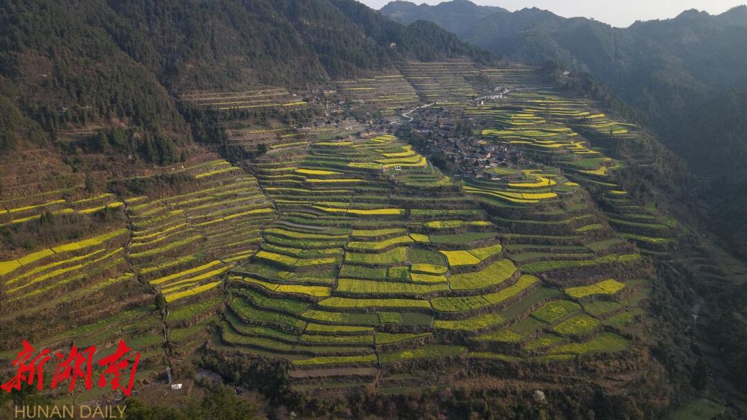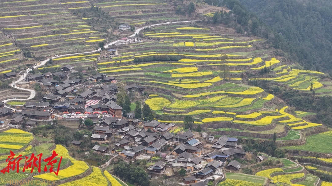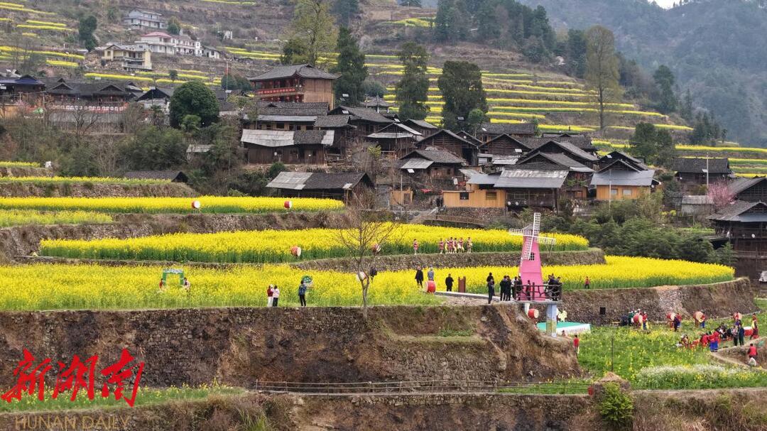 新湖南客户端3月22日讯(通讯员 张棋铭 杨昊天 郑湘 田家全) 阳春三月,当湘西土家族苗族自治州 古丈 县 高峰镇岩排溪村的千 亩 梯田油菜花次第绽放,片片流动的金色海洋便悄然浸入 古朴 的村落 ,金黄色的油菜花田在云海中若隐若现。层叠的梯田、金黄的花海、连绵的群山、散落的民居,构成了一幅美丽的春日画卷。 3月22日,以“金色梯田·非遗乡韵”为主题的古丈•岩排溪第二届梯田油菜花旅游季在此拉开序幕。