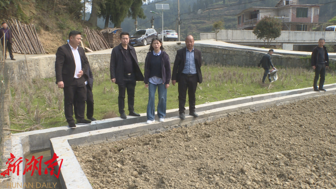 图为王慧敏在查看汀坪乡桂花村高标准农田建设情况