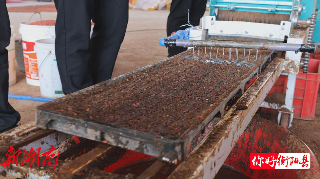 在栏垅乡荷鸣村种粮大户刘少华的育秧工厂里,水稻育秧流水线高效运转,村民们互相配合,熟练地将秧盘放置在育秧线上,不到一分钟的时间就完成了铺基质、撒种、洒水、覆盖等工序。