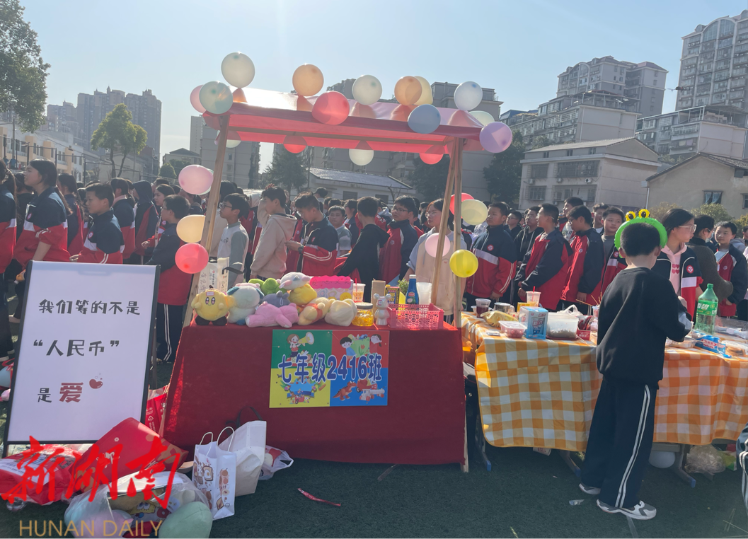 湖南日报·新湖南客户端3月24日讯 (通讯员 陈理 黄琨)“来来来,清仓大卖等你来,我们等的不是人民币,是爱!”3月21日,湘阴县文星中学七年级全体师生在学校田径场开展“义起献爱心,共筑暖春情”爱心义卖活动。