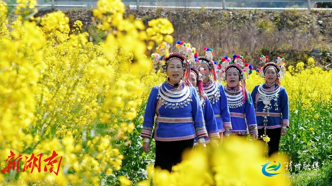 潘学文和姐妹们在油菜花丛中放声高歌(明睿 摄)