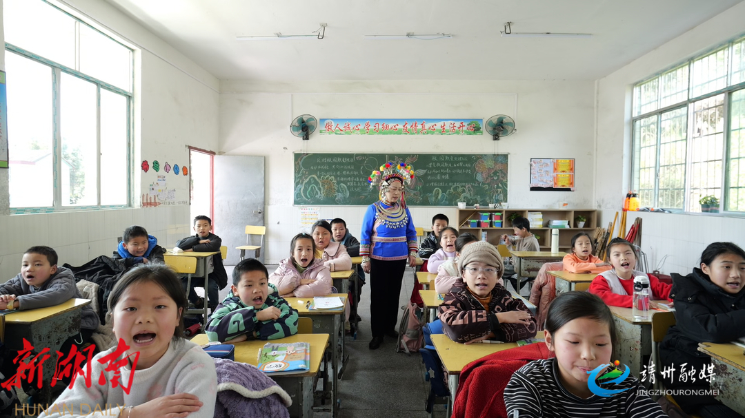 潘学文在藕团小学教学生们唱苗族歌鼟(明睿 摄)