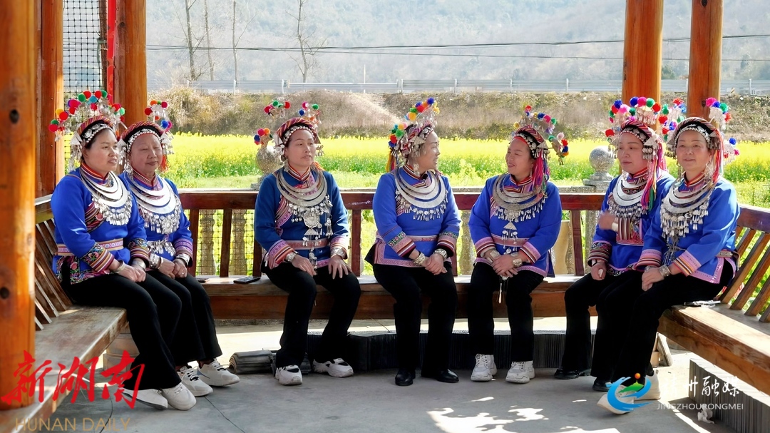 3月19日,在藕团乡藕团村的一座凉亭内,身着苗服的潘学文正放声高歌自己创作的山歌调,围坐在一起的村民们应声接唱,歌声悠扬婉转。