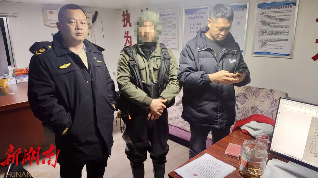 3月14日凌晨 渔政执法人眼 会同水警大队现场抓获 4四名锚鱼人员, 今年以来,湘阴渔政共查获锚鱼案33个,清理丝网700余米 。湘阴渔政供图