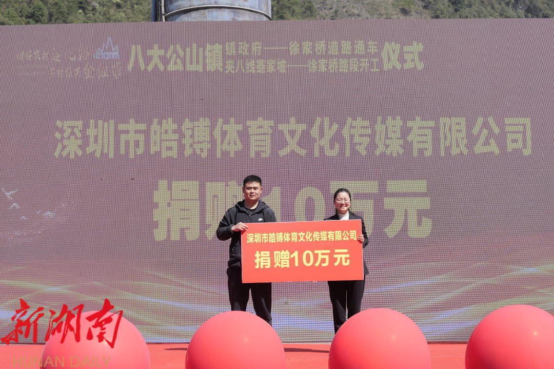 仪式现场,八大公山镇相关负责人介绍了八大公山镇徐家桥-镇政府道路相关信息,群众代表分享了该道路建成后的积极影响。随后,深圳市皓镈体育文化传媒有限公司向八大公山镇捐赠10万元道路养护基金。
