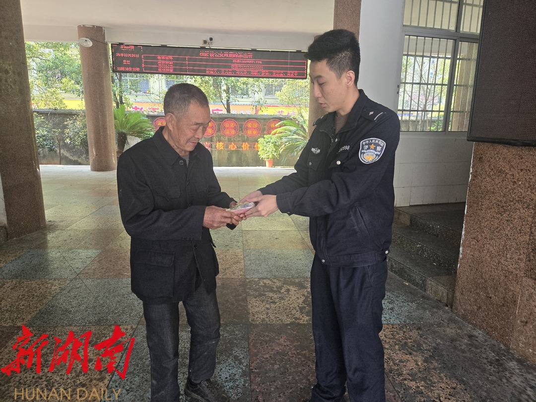 在县公安局鹿峰派出所,办案民警将追回的钱款转交给报警人邓爷爷。老人现场清点钱数,难掩喜悦之情,激动地握住办案民警的手表示感谢。