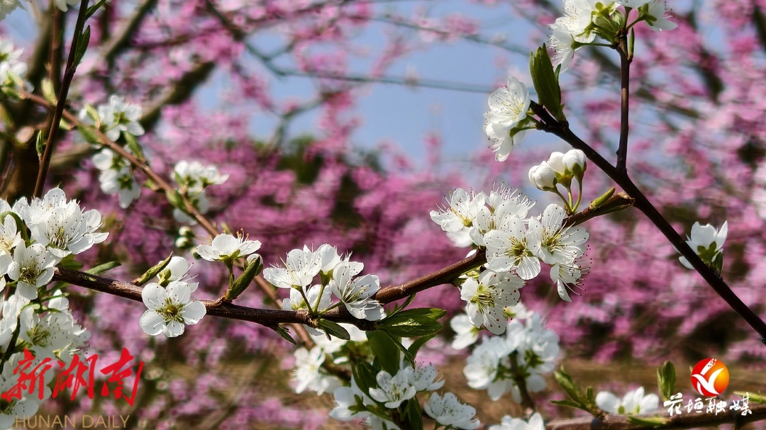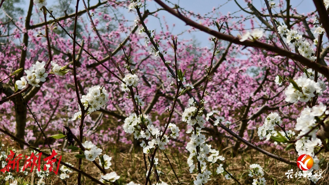 放眼望去,藏在桃花林里的梨花也开始绽放,点缀其中,红白交映,楚楚动人,令人心醉,为春天增添了温暖绚丽的色彩。
