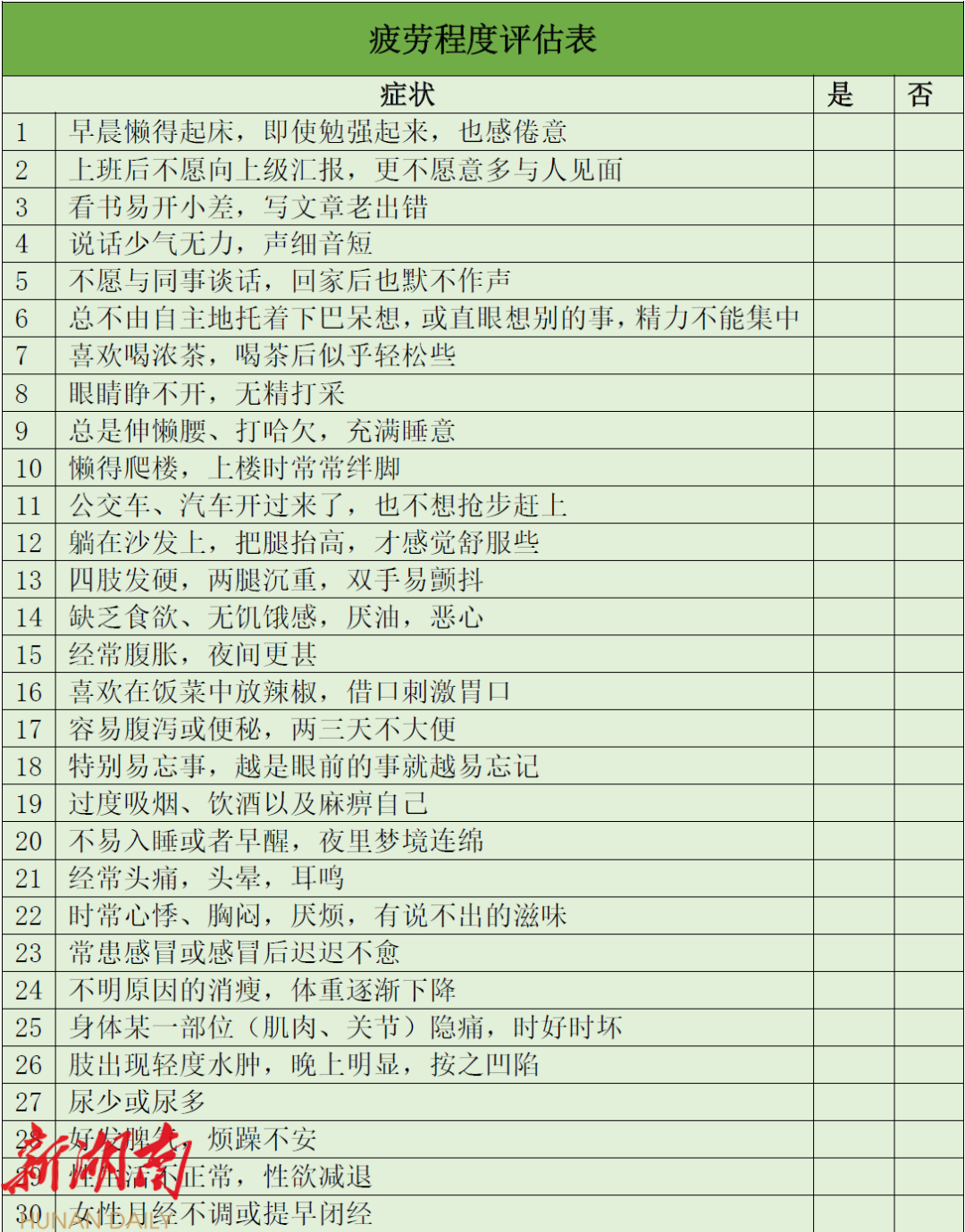 在以上30项中若有2~3项,表示轻度疲劳;若有4~5项,表示中度疲劳;若有6~8项,表示重度疲劳并提示有潜在疾病;若有9~10项或以上,可能已经患了慢性疲劳综合征。