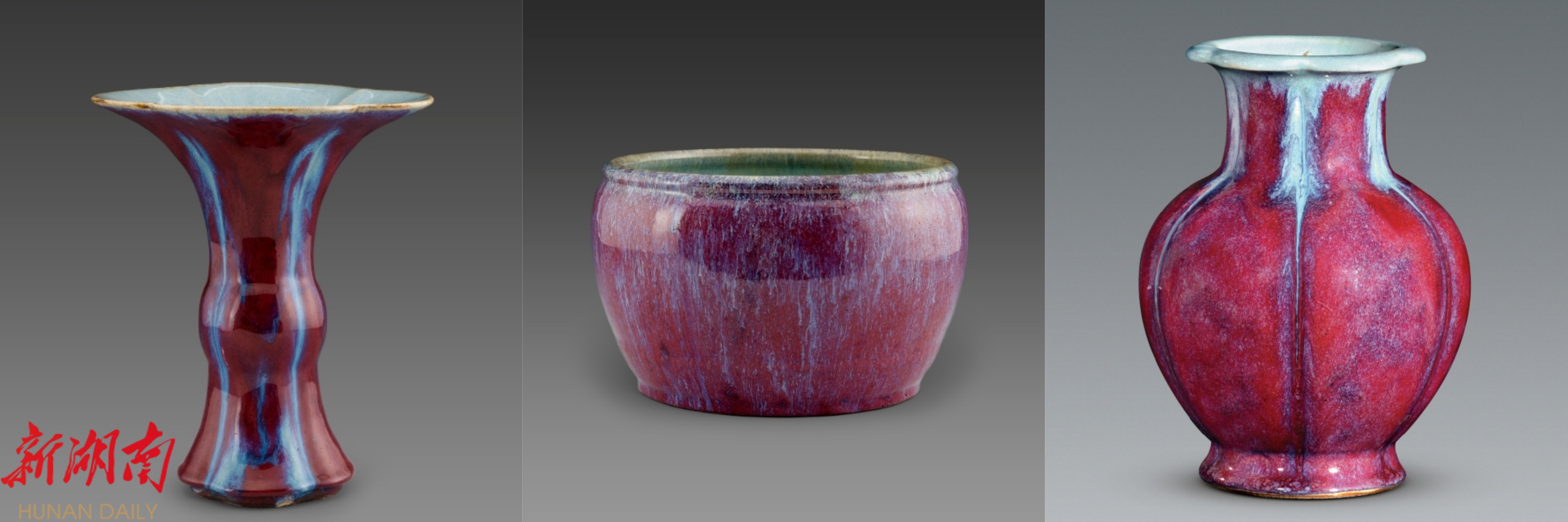△从左到右依次为:清乾隆·景德镇窑钧红釉海棠式花觚,上海博物馆藏;清雍正·景德镇窑钧红釉缸,上海博物馆藏;清乾隆·窑变釉石榴尊,河北博物院藏。