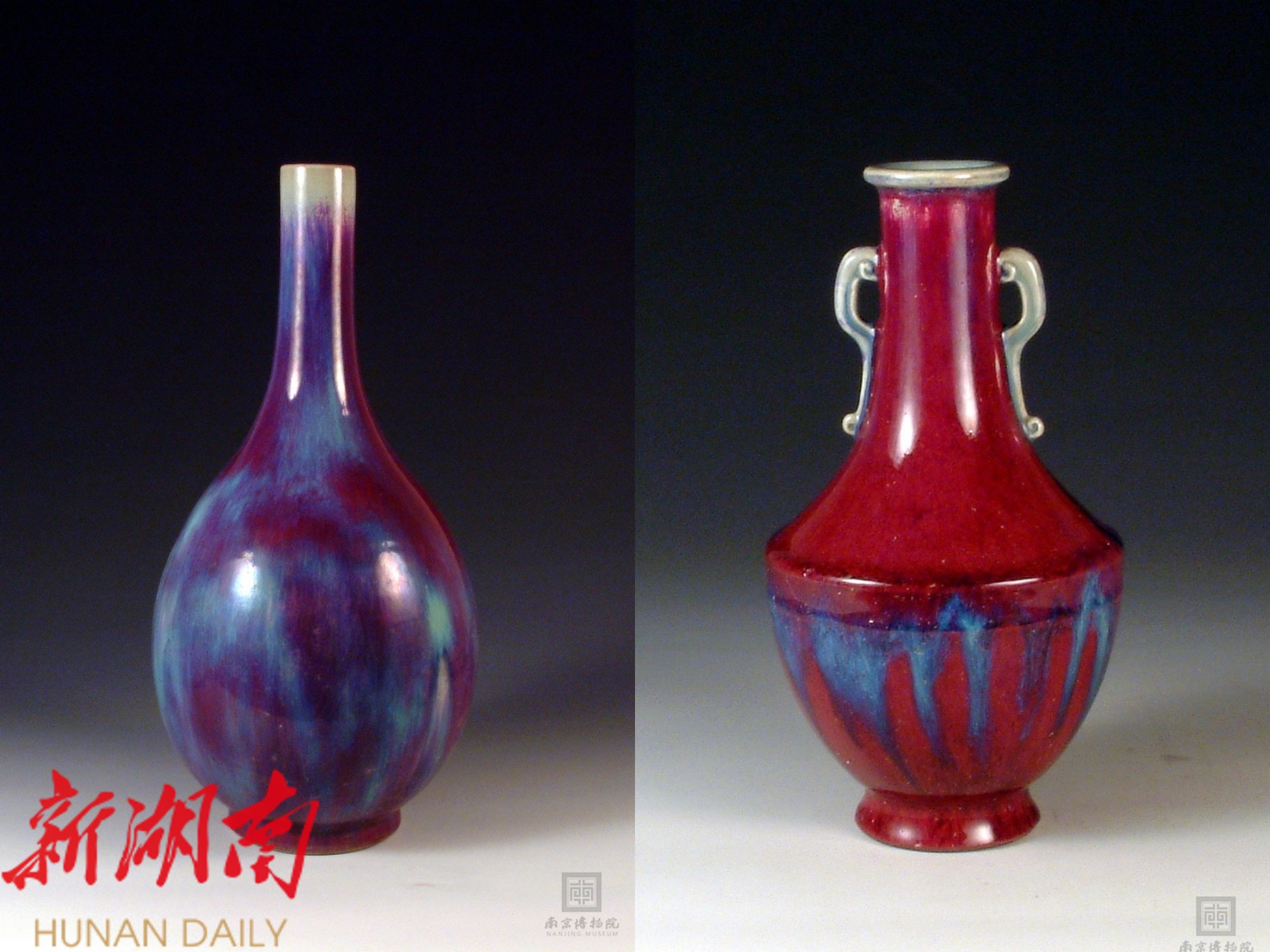 △左为清乾隆·钧红釉胆式瓷瓶,右为清乾隆·仿钧红釉双耳瓷瓶,均为南京博物院藏。
