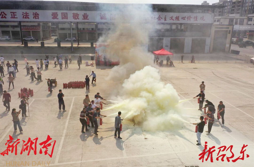 演练模拟邵东城发运输有限公司停车场内突发火灾,浓烟迅速蔓延。监控中心发现险情后立即启动应急预案,灭火组队员携带干粉灭火器迅速抵达现场,按照“一提二拔三压四喷”规范操作扑灭火源。